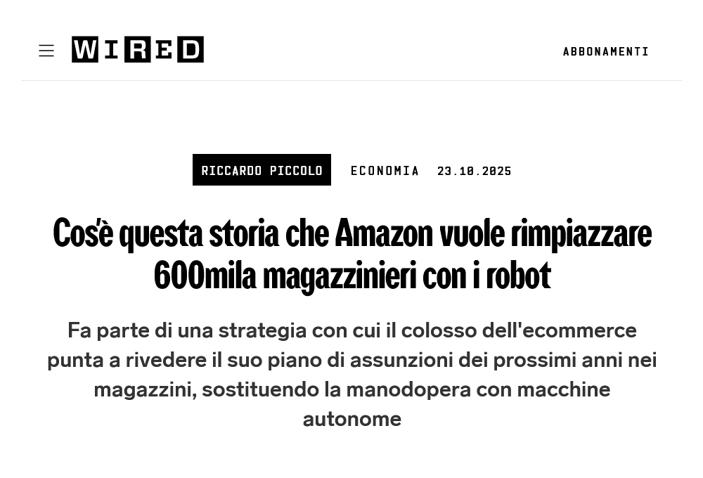 Ma io credo che la massa lavoratrice ( per estensione, il Popolo ) non sia affatto vittima innocente, incolpevole e santa, bensì colpevole compartecipe del proprio supplizio. La Tecnica dev'essere studiata, compresa, e controllata al fine di produrre beneficio per la collettività. 3 Concludendo. Nell'attesa di tornare a vivere di stenti nei boschi, ma secondo qualcuno felici ... vado a fare un ordine su Amazon. ☺ = Note [1] : ''Cos'è questa storia che Amazon vuole rimpiazzare 600mila magazzinieri con i robot'', Riccardo Piccolo, Wired ITA, 23 ottobre 2025, [ https://www.wired.it/article/amazon-robot-sostituzione-lavoratori/ ]; vedi : ''Amazon Plans to Replace More Than Half a Million Jobs With Robots'', Karen Weise, The New York Times, 21 ottobre 2025, [ https://www.nytimes.com/2025/10/21/technology/inside-amazons-plans-to-replace-workers-with-robots.html ]; vedi anche : ''Amazon Aims to Replace 600,000 Future Hires With Robots, According to Leaked Documents'', Sherin Shibu, Entrepreneur, 22 ottobre 2025, [ https://www.entrepreneur.com/business-news/amazon-aims-to-replace-600000-workers-with-robots/498636 ]. [2] : ''Amazon has more than 1 million robots that sort, lift, and carry packages—see them in action'', Tyler Greenawalt, Amazon, agg. il 22 ottobre 2025, [ https://www.aboutamazon.com/news/operations/amazon-robotics-robots-fulfillment-center ]. [3] : ''Amazon licenzia 14mila dipendenti, il piano ne prevede 30mila: "Sostituiti dall'IA"'', Rai News, 28 ottobre 2025, [ https://www.rainews.it/articoli/2025/10/amazon-licenzia-30mila-dipendenti-10-per-cento-sostituiti-da-intelligenza-artificiale-208de113-b02d-4752-a4d2-565374bf5e81.html ]. [4] : ''Amazon robots could replace over 160,000 new jobs by 2027, over 600,000 by 2033'', Brad Matthews, The Washington Times, 22 ottobre 2025, [ https://www.washingtontimes.com/news/2025/oct/22/amazon-robots-could-replace-160000-new-jobs-2027-600000-2033/ ]. [5] : ''Amazon Adds That Robotic Touch'', John Letzing, The Wall Street Journal, agg. il 20 marzo 2012, [ https://www.wsj.com/articles/SB10001424052702304724404577291903244796214 ]; vedi : ''Kiva Systems, an Amazon company'', Joseph W. Durham, Multi-Robot Systems, 16 dicembre 2014, [ https://www.multirobotsystems.org/?q=node/87 ]. [6] : ''Amazon Robotics'', Amazon, [ https://www.aboutamazon.com/news/tag/robotics ]; WIki ENG : [ https://en.wikipedia.org/w/index.php?title=Amazon_Robotics&oldid=1310239079 ]. [7] : ''Amazon Testing New Warehouse Robots and AI Tools for Workers'', Sean McLain, The Wall Street Journal, agg. il 22 ottobre 2025, [ https://www.wsj.com/tech/amazon-testing-new-warehouse-robots-and-ai-tools-for-workers-8e3d885a ]. [8] : ''Inside Amazon’s AI and Robotics Push'', Conor Grant, The Wall Street Journal, 24 ottobre 2025, [ https://www.wsj.com/tech/ai/inside-amazons-ai-and-robotics-push-9c5a0aae ]. [9] : ''Take a look inside the Amazon fulfillment center in Shreveport'', Makenzie Boucher, Shreveport Times, 28 settembre 2024, [ https://eu.shreveporttimes.com/story/money/business/2024/09/28/take-a-look-inside-the-amazon-fulfillment-center-in-shreveport/75347090007/ ]. [10] : ''Amazon Opens Its Most Advanced Fulfillment Center in Shreveport, La.'', Supply Chain 24/7, 15 ottobre 2024, [ https://www.supplychain247.com/article/amazon-opens-most-advanced-fulfillment-center-shreveport-louisiana ]. [11] : ''Inside Shreveport's Amazon Robotics Fulfillment Center on Cyber Monday'', KTBS 3 News, YouTube, 3 dicembre 2024, [ https://www.youtube.com/watch?v=fg0V6yN3Qeg ]. [12] : ''Amazon preferisce i robot agli operai: barbarie capitalista'', Lelio Demichelis, Agenda Digitale, 27 ottobre 2025, [ https://www.agendadigitale.eu/industry-4-0/amazon-preferisce-i-robot-agli-operai-barbarie-capitalista/ ]. === --- { prima pubblicazione del post su VK, il 29 ottobre 2025 [13]; su FB : [14] }. |