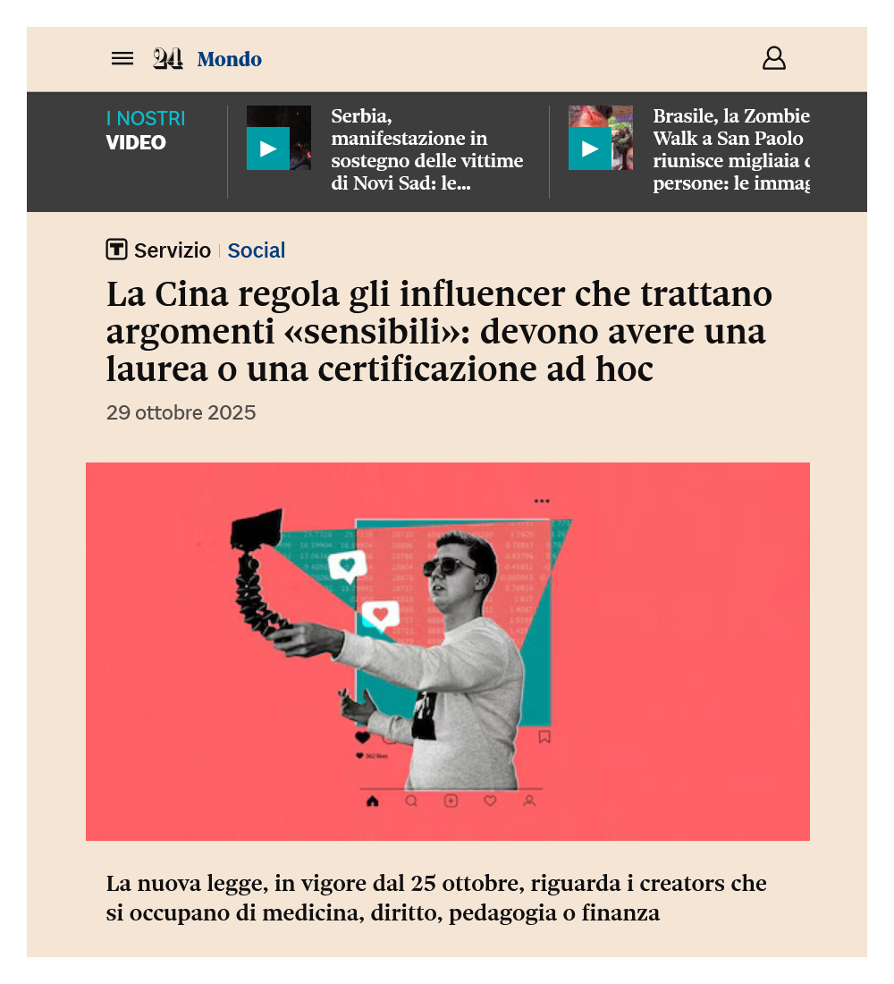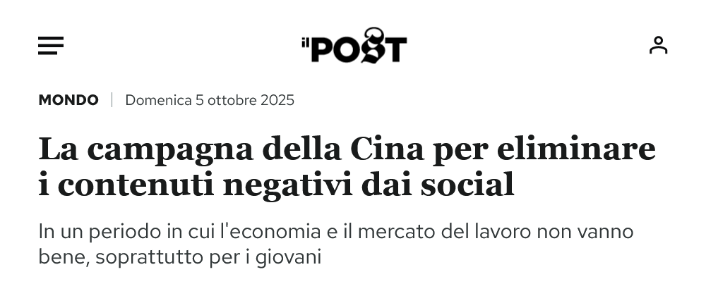 In altre parole, i singoli cittadini possono costruirsi un'opinione personale sui fatti di maggiore rilevanza, ma non possono esprimerla nei social network. 3 Due cose da dire : ● ho pubblicato due titoli del mainstream ufficialista senza alcun controcanto, siccome non ho trovato al volo gli approfondimenti nei siti-web dell'area alternativa; vi ringrazierò, se mi proporrete tali letture oppositive; e ricordo che, ogni tanto, anche le testate mainstream devono scrivere qualcosa di vero – certo, sarebbe auspicabile che la critica alla parte avversa venisse espletata senza cadere sovente nella propaganda, come ho/abbiamo visto innumerevoli volte durante il biennio covidista e il conflitto russo-ucraino; ● non solo parte dell'area oppositiva di matrice comunista guarda con ammirazione la RPC, ma, purtroppo, anche una parte – forse maggioritaria – degli amministratori della cosa pubblica concupisce proprio questi strumenti repressivi applicati su larga scala in quel vasto Paese. Ad maiora. = Note [1] : ''La campagna della Cina per eliminare i contenuti negativi dai social'', il Post, 5 ottobre 2025, [ https://www.ilpost.it/2025/10/05/cina-emozioni-negative-social-media/ ]. [2] : ''La Cina regola gli influencer che trattano argomenti «sensibili»: devono avere una laurea o una certificazione ad hoc'', Il Sole 24 Ore, 29 ottobre 2025, [ https://www.ilsole24ore.com/art/la-cina-regola-influencer-che-trattano-argomenti-sensibili-devono-avere-laurea-o-certificazione-ad-hoc-AHrEZmQD ]. === --- { prima pubblicazione del post su VK, il 3 novembre 2025 [3]; su FB : [4] }. |