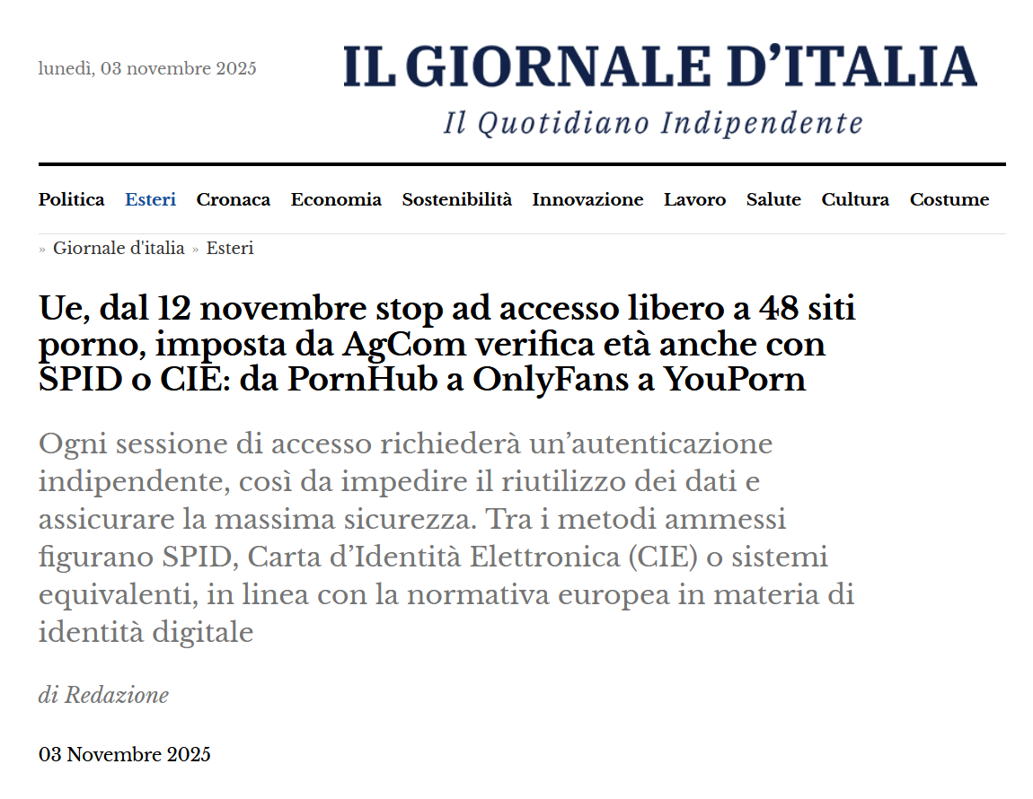 Ops. ☺ Come specificato in chiusura di paragrafo, nemmeno questa opzione tutela il rispetto dell'anonimato dell'utente, cui non può essere garantito con certezza che la società certificatrice della maggiore età non comunichi i dati personali con quella che gestisce il sito-web ''proibito''. Inoltre, il certificato ( file binario ) può essere comunque essere prodotto da un maggiorenne e usato da un minorenne, e duplicato ... eccetera. 1.3.2 Nell'allegato C sono pubblicate le risposte scritte di alcuni operatori del settore ( alcuni hanno espresso l'intenzione di rimanere anonimi ) alla suddetta consultazione [23]. Alla fine di ottobre, l'AGCOM ha stabilito la data di applicazione del provvedimento ( mercoledì 12 novembre ) e pubblicato la lista ( revisionata ) dei 45 siti-web che dovranno adeguarsi, pena l'essere sanzionati fino a 250.000 € e l'oscuramento sul territorio nazionale italiano [24][25]. Nella prima edizione della lista, che era di 48 siti, erano stati pubblicati gli indirizzi-web comprensivi delle chiavi di ricerca e altri dati personali lasciati dal personale dell'agenzia [26]. ☺ 2 Concludendo. Assistiamo all'ulteriore proliferazione della metastasi burocratica psicotica, mossa retoricamente da fieri proclami sulla difesa dei minori ma nei fatti bacchettona e ostativa la pornografia cioè i diritti individuali dionisiaci del mostrarsi e di guardare. La procedura di accesso ridefinita con un maggiore numero di passaggi è farraginosa, e inibirà una quota importante di utenti maggiorenni che presumibilmente non vorranno inviare prove documentali della propria identità a un'app oppure a un sito-web intermedio, o, magari e più semplicemente, non vorranno perdere tempo in tali sciocchezze, ed opteranno per saltare il controllo con altre modalità di navigazione come la rete VPN { [27][28]... }. Inoltre, provvedimenti come questo scavalcano la responsabilità genitoriale del controllo sulla navigazione internettiana della prole, agibile con l'ausilio di un software di parental control – pure citato nel decreto-legge del 2023, all'art. 13 – con il quale è possibile escludere intere liste di siti-web dall'esperienza dell'utente minorenne sullo smartphone e altri dispositivi { [29][30]... }. Anche se gli effetti pratici saranno limitati, si tratta pur sempre dell'ennesimo tassello della pedagogia del controllo che abbiamo purtroppo assaggiato negli ultimi anni, e della progressiva profilazione degli utenti. Infine. Sono proprio curioso di vedere SE, il 12 novembre, il sistema sarà pronto ed efficiente nel produrre i patetici ''certificati di maggiore età''. = Note [1] : ''Ue, dal 12 novembre stop ad accesso libero a 48 siti porno, imposta da AgCom verifica età anche con SPID o CIE: da PornHub a OnlyFans a YouPorn'', Il Giornale d'Italia, 3 novembre 2025, [ https://www.ilgiornaleditalia.it/news/esteri/745731/ue-dal-12-novembre-stop-ad-accesso-libero-a-48-siti-porno-imposta-da-agcom-verifica-eta-anche-con-spid-o-cie-da-pornhub-a-onlyfans-a-youporn.html ]. [2] : ''Sciolto il comune di Caivano, il governo Meloni nomina 3 commissari'', Giuseppe Cozzolino, Fanpage[punto]it, 16 ottobre 2023, [ https://www.fanpage.it/napoli/sciolto-il-comune-di-caivano-nominati-tre-commissari-dal-consiglio-dei-ministri/ ]; vedi : ''Il CdM ha disposto scioglimento del Consiglio comunale di Caivano, nominati 3 commissari prefettizi'', Ministero dell'Interno, Governo italiano, 17 ottobre 2023, [ https://www.interno.gov.it/it/cdm-ha-disposto-scioglimento-consiglio-comunale-caivano-nominati-3-commissari-prefettizi ]. [3] : ''Caivano (Napoli), rissa alla prima comunione. Il padre della festeggiata alla moglie: «Do fuoco a te e tuo padre». L’uomo positivo all’alcol test'', Ugo Milano, Open, 8 settembre 2025, [ https://www.open.online/2025/09/08/caivano-napoli-rissa-prima-comunione/ ]. [4] : ''Stesa al Parco Verde di Caivano: gruppo di scooter spara sfrecciando tra i palazzi'', Nico Falco, Fanpage[punto]it, 27 settembre 2025, [ https://www.fanpage.it/napoli/spari-al-parco-verde-di-caivano-sopralluoghi-dei-carabinieri-in-corso/ ]. [5] : ''Rifiuti pericolosi da Caivano verso la Turchia, 370 tonnellate sequestrate dai carabinieri'', Giuseppe Cozzolino, Fanpage[punto]it, 6 ottobre 2025, [ https://www.fanpage.it/napoli/rifiuti-pericolosi-da-caivano-verso-la-turchia-370-tonnellate-sequestrate-dai-carabinieri/ ]. [6] : ''Nel palazzo un nascondiglio elettronico pieno di cocaina pura: blitz al “Bronx” di Caivano'', Nico Falco, Fanpage[punto]it, 8 ottobre 2025, [ https://www.fanpage.it/napoli/nel-palazzo-un-nascondiglio-elettronico-pieno-di-cocaina-pura-blitz-al-bronx-di-caivano/ ]. [7] : ''Coltelli a scuola, per Caivano e Napoli un piano di controlli con metal detector agli ingressi'', Corriere del Mezzogiorno, Corriere della Sera, 20 ottobre 2025, [ https://napoli.corriere.it/notizie/cronaca/25_ottobre_20/coltelli-a-scuola-a-caivano-e-napoli-metal-detector-agli-ingressi-7f3322f1-40e3-4c81-90cf-e23170b35xlk.shtml ]. [8] : cercando ''Caivano Napoli'' nelle Notizie del motore di ricerca di Google, viene prodotta una lista interminabile di fattacci di cronaca nera turpi accaduti negli anni; ho elencato solo alcune cronache per dare un'idea cangiante della condizione degradata di quel territorio dell'hinterland napoletano. [9] : ''FdI non presenterà la lista per le Comunali a Caivano'', NapoliToday, 25 ottobre 2025, [ https://www.napolitoday.it/politica/elezioni-comunali-caivano-2025-fdi.html ]. [10] : ''In G.U. il D.L. Caivano di contrasto alla criminalità giovanile'', Pietro Molino, Altalex, 19 settembre 2023, [ https://www.altalex.com/documents/2023/09/19/g-u-d-l-caivano-contrasto-criminalita-giovanile ]; vedi : ''In GU la conversione del decreto Caivano: le novità'', Pietro Molino, Altalex, 15 novembre 2023, [ https://www.altalex.com/documents/2023/11/15/gu-conversione-decreto-caivano-novita ]. [11] : ''TESTO COORDINATO DEL DECRETO-LEGGE 15 settembre 2023, n. 123'', Gazzetta Ufficiale della