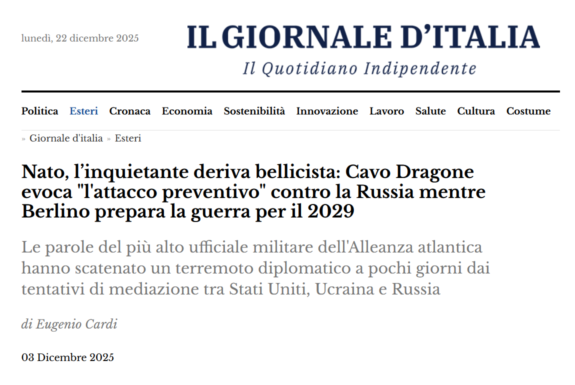 Notizie di Marco Poli Nel tempo in cui le figure politicanti sono macchiette ridicole, vanno considerate con la massima serietà le parole dei militari. Abbiamo visto come la gran parte degli alti ufficiali italiani in congedo ( menziono al volo i generali Bertolini [1], Boni [2], Dorliguzzo [3], Mini [4]...; alcuni hanno ricoperto cariche apicali nell'organigramma dell'alleanza atlantica ), divenuti poi analisti e saggisti, ha cassato la strategia NATO–UE e contraddetto molte volte la farneticante e ideologizzata narrazione atlantista. Sull'altro lato troviamo il solo Vincenzo Camporini [5], la cui tentata carriera politica dichiara il proprio orientamento unionista e anti-russo ( +Europa, Azione ). Altro discorso riguarda i militari attualmente in carriera, che rispondono agli ordini. Tra questi, spicca la figura puntuta dell'ammiraglio Giuseppe Cavo Dragone. 1.1 Cito alcuni capitoli di una carriera notevole [6]: ● 1987, comandante del cacciamine Milazzo con il grado di tenente di vascello; ● 1990, brevetto per i caccia convenzionali imbarcati e abilitazione di pilota di aviogetto negli USA; ● 1991, primo comandante del Gruppo Aerei Imbarcati sulla portaeromobili Giuseppe Garibaldi; ● 1993, comandante in capo della squadra navale come addetto alle operazioni e all'addestramento della componente aerea imbarcata; ● 1996, comandante della fregata Euro con il grado di capitano di fregata; ● 1997, torna al comendo del Gruppo Aerei Imbarcati; ● 2002, comandante della portaerei Giuseppe Garibaldi – in quel momento nave ammiraglia della flotta – con il grado di capitano di vascello; ● 2005, comandante dell'Aviazione Navale e di capo del 6º Reparto Aeromobili dello stato maggiore della Marina; durante questo periodo è promosso contrammiraglio; ● 2008, comandante del Raggruppamento subacquei ed incursori ( COMSUBIN ); ● 2011, comandante dell'Accademia navale; ● 2014, capo del Comando interforze per le operazioni delle forze speciali con il grado di ammiraglio di divisione; ● 2016, comandante del comando operativo di vertice interforze con il grado di ammiraglio di squadra; ● 2019, capo di stato maggiore della Marina Militare; ● 2021, capo di stato maggiore della difesa con il grado di ammiraglio; ● 2025, presidente del Comitato militare della Nato, la massima carica militare nell'ambito dell'Alleanza [7][8]. 2 Nel mezzo delle lunghe – e, secondo me, improbabili – trattative per una cessazione delle ostilità in Ucraina, la massima carica militare della NATO ha fatto un'uscita al Financial Times ( FT; quotidiano economico britannico fondato nel 1888, di proprietà del gruppo editoriale giapponese Nikkei ) che a parecchi osservatori propensi al vero pacifismo è sembrata improvvida :